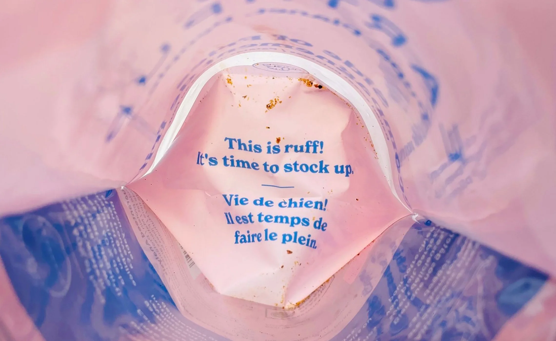 Various elements were thoughtfully added to inject personality. Icons were used to help highlight important details while clever copywriting is used throughout like “Perfect for showing your pup that food is life.” as a way to tell the customer why they should consider purchasing this treat for their pup, or the message you can only see from inside when the pouch is empty, “This is ruff! It’s time to stock up.”. Even the window to show the product is shaped to mimic a big, wide smile!