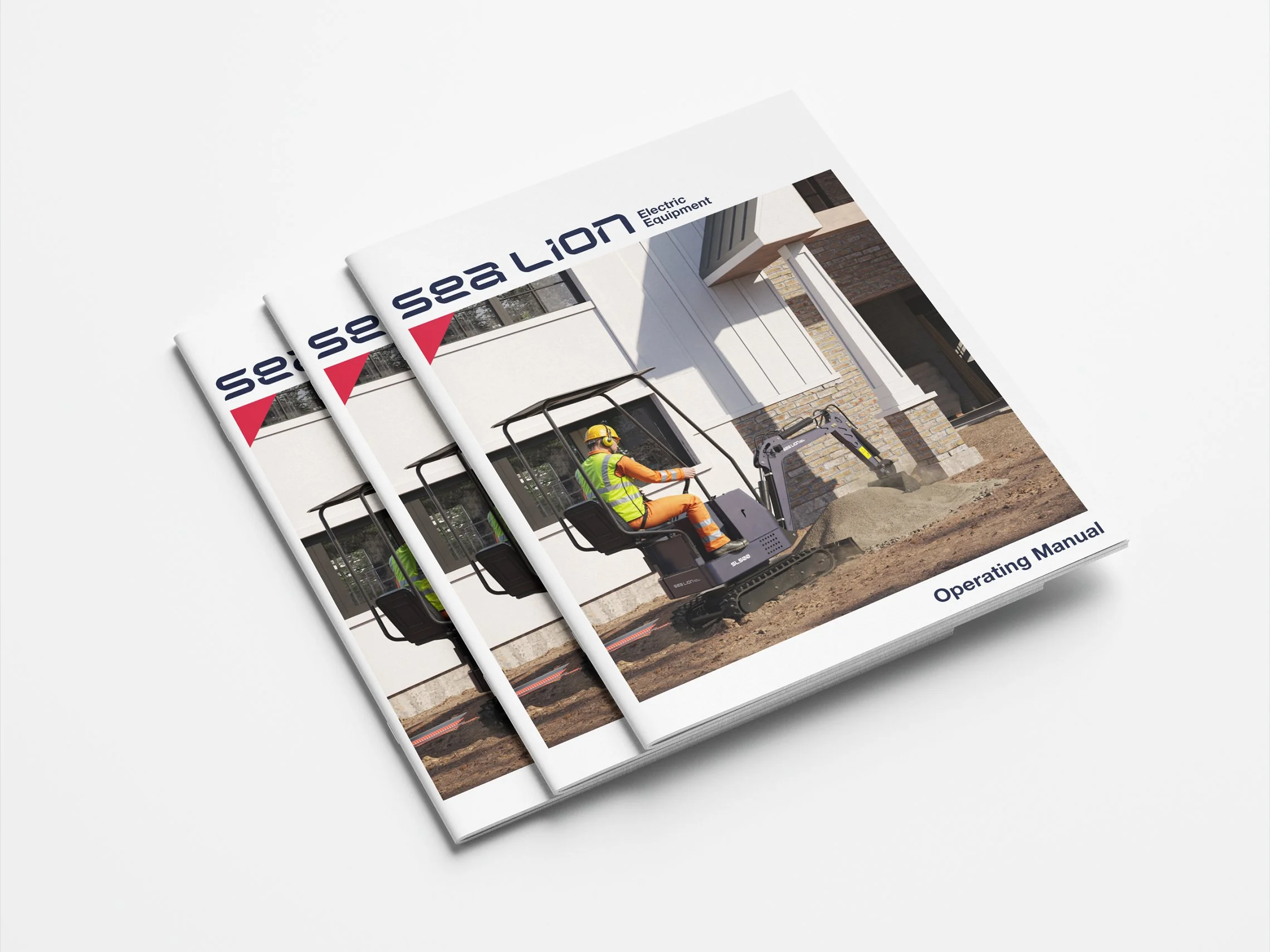 Every element of the visual identity system to had align with this ethos. The result is a custom typeface that was created for the logotype that felt quick and agile. It’s bold, modern, and aims to stand out among similar brands, while feeling familiar to customers who are familiar with those brands. The typeface was further expanded into numbers used to differentiate excavator models. A geometric sea lion icon was developed as a secondary mark, subtly used across branding, marketing, and products. The colour palette keeps the visual language feeling light and fresh, bringing in bold colour as needed, the notches removed from the logotype are used as a design element, while timeless typography balances everything out.