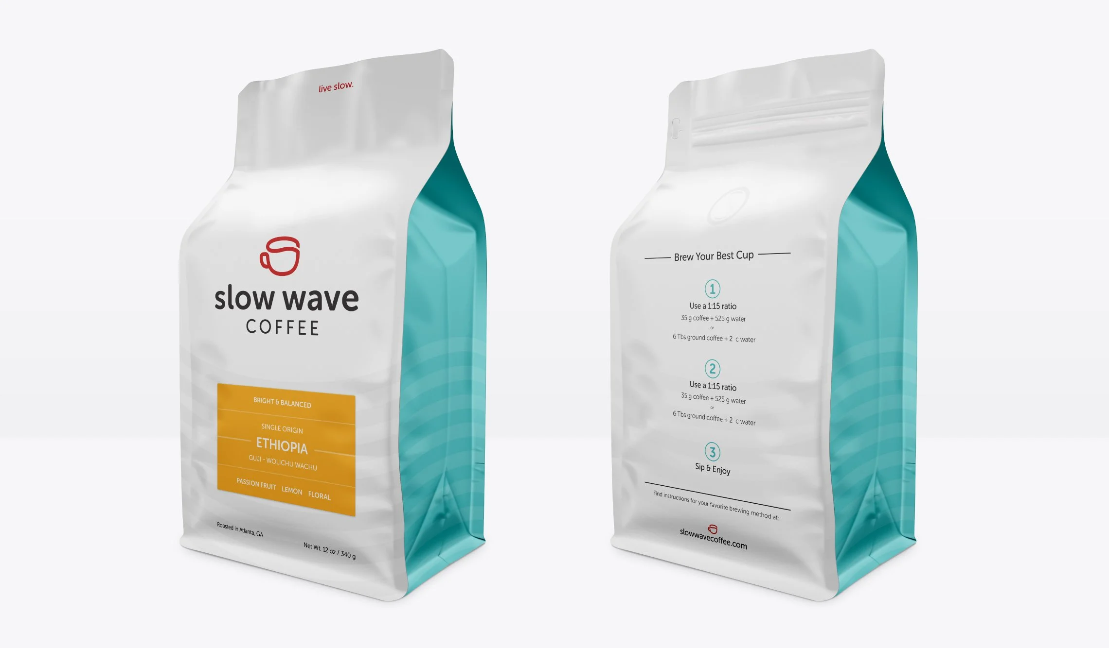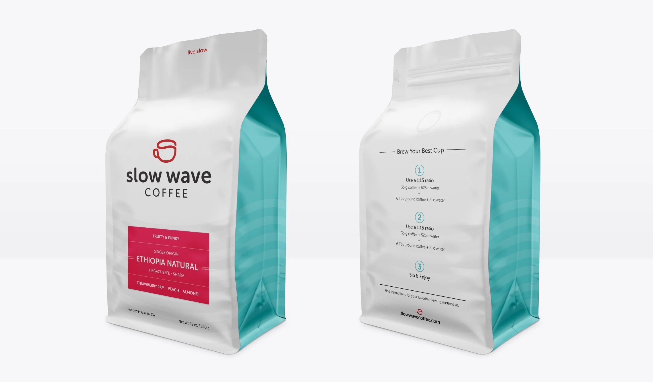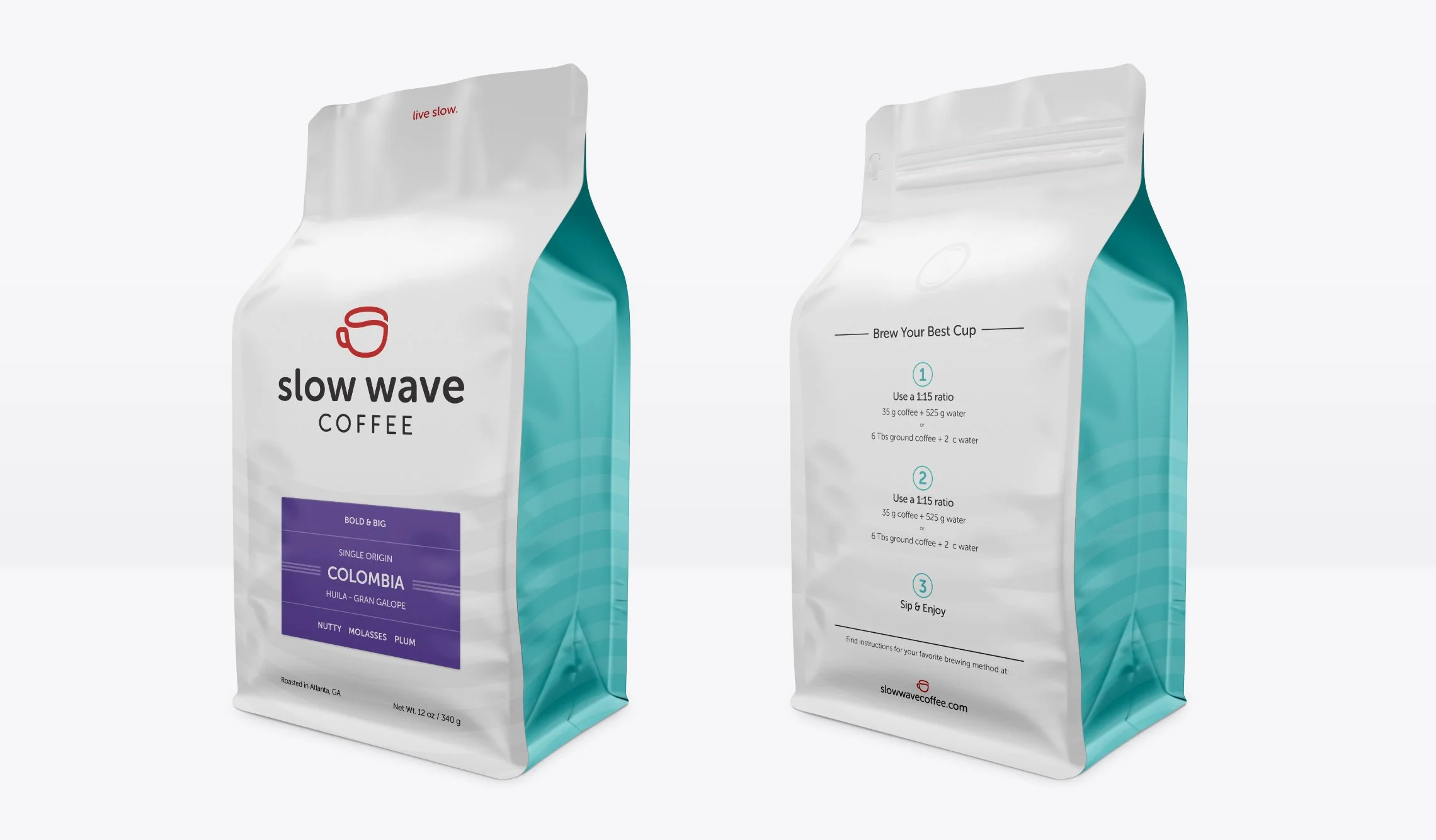 By creating four distinct roast profiles, Slow Wave takes the guess work out of finding a coffee that will fit your flavour preferences. These colourful profile labels jump out on the clean, white pouches. Instructions to brew your best cup are featured on the back to be informative and helpful to someone who is beginning their coffee journey.