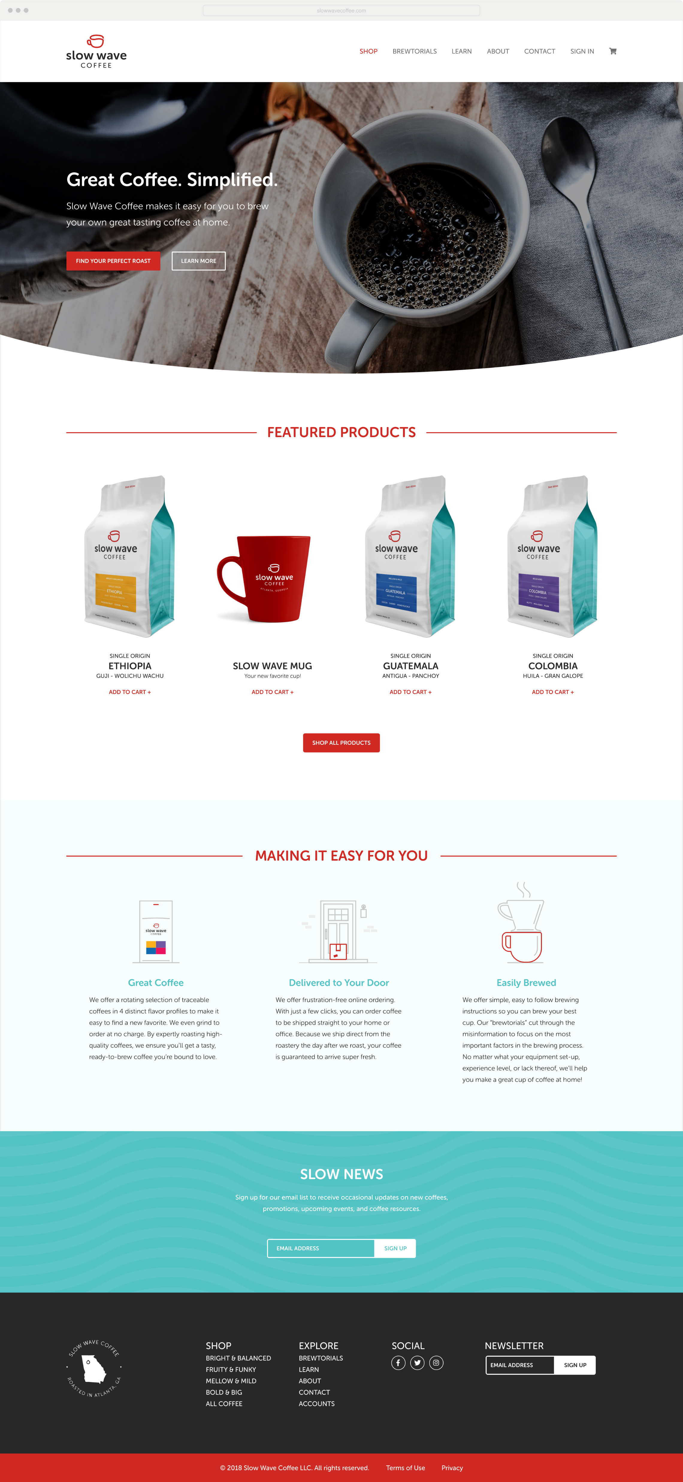 The husband and wife team behind Slow Wave Coffee approached me to help with their new journey. I was initially tasked with naming the business, establishing their branding and packaging, as well as setting up their brand strategy to help them stay on track throughout their journey. We determined that their brand needed to be uncomplicated, authentic, and most importantly, non-pretentious. Slow Wave Coffee is positioned to be a gateway into enjoying high-quality coffee without overly complex brewing methods and expensive equipment, regardless of where you're at in your coffee journey.